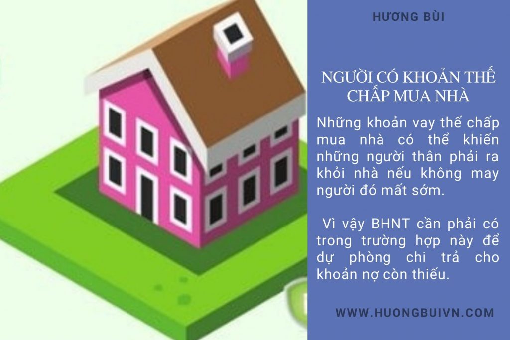Nếu bạn bạn thuộc nhóm có khoản thế chấp để mua nhà ở, thì bạn cần có BHNT. BHNT sẽ đảm bảo gia đình bạn không bị mất nhà trong trường hợp mình không may bị tử vong hoặc thương tật toàn bộ vĩnh viễn. Bởi không gì tệ hơn là người thân yêu của bạn bị rời khỏi nhà trong thời gian mất người thân phải không?